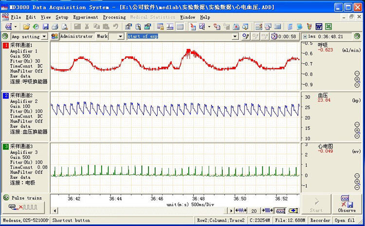 ll 數(shù)據(jù)采集軟件:MD3000生物信號采集處理系統(tǒng)進行采集存儲數(shù)據(jù)、顯示波形、后期數(shù)據(jù)的處理與統(tǒng)計